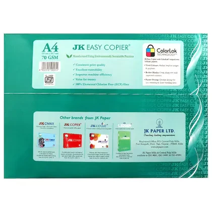 Features & Details Multipurpose paper Sparkling white paper Description Ideal for photocopying and printing, JK Easy Copier 70 GSM A4 Paper Rim has been one of the stationery products that has never gone out of use, and always served the customers in more ways than possible. White and bright, these sheets help achieve the contents to be printed to have better print clarity and understanding. Go ahead and buy this product online today! Disclaimer: Despite our attempts to provide you with the most accurate information possible, the actual packaging, ingredients and colour of the product may sometimes vary. Please read the label, directions and warnings carefully before use.